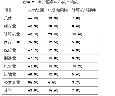 資料來源:John Anton(美),Call Center Management by Numbers。表14-2的統(tǒng)計(jì)數(shù)據(jù)來源主要是美國客戶服務(wù)中心,國內(nèi)客戶服務(wù)中心的統(tǒng)計(jì)結(jié)果會(huì)有些不同。特別是在人力成本上,不僅在行業(yè)的排序上會(huì)有些不同,而且在占整個(gè)成本的比瓜也會(huì)不同。比如計(jì)算機(jī)行業(yè),在國內(nèi)計(jì)算機(jī)行業(yè)的人力成本相對較高,因此在整個(gè)成本的比重上相對于其他行業(yè)不會(huì)是最低的。同時(shí),國內(nèi)的人力成本在整個(gè)成本比重上相對要比美國低,這是因?yàn)閲鴥?nèi)勞動(dòng)力價(jià)格相對較低,客戶服務(wù)中心的從業(yè)人員尤其如此。雖然如此,由于國內(nèi)不少企業(yè)不采用800號(hào)碼,從而不承擔(dān)全部通信費(fèi)用,且其他成本要素的相對價(jià)格也比美國要低。但在國內(nèi),人力成本在整個(gè)成本中的比重還是最人的,通常在50%-60%之間。